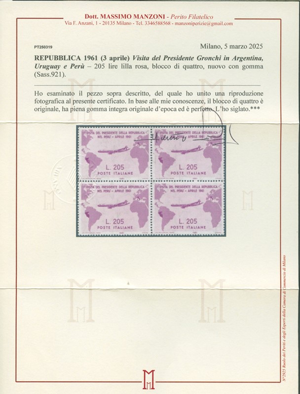 1961 - 205L lilla rosa 'Gronchi Rosa' BL4. CF Manzoni (Sassone 921 - Euro 7.600+)