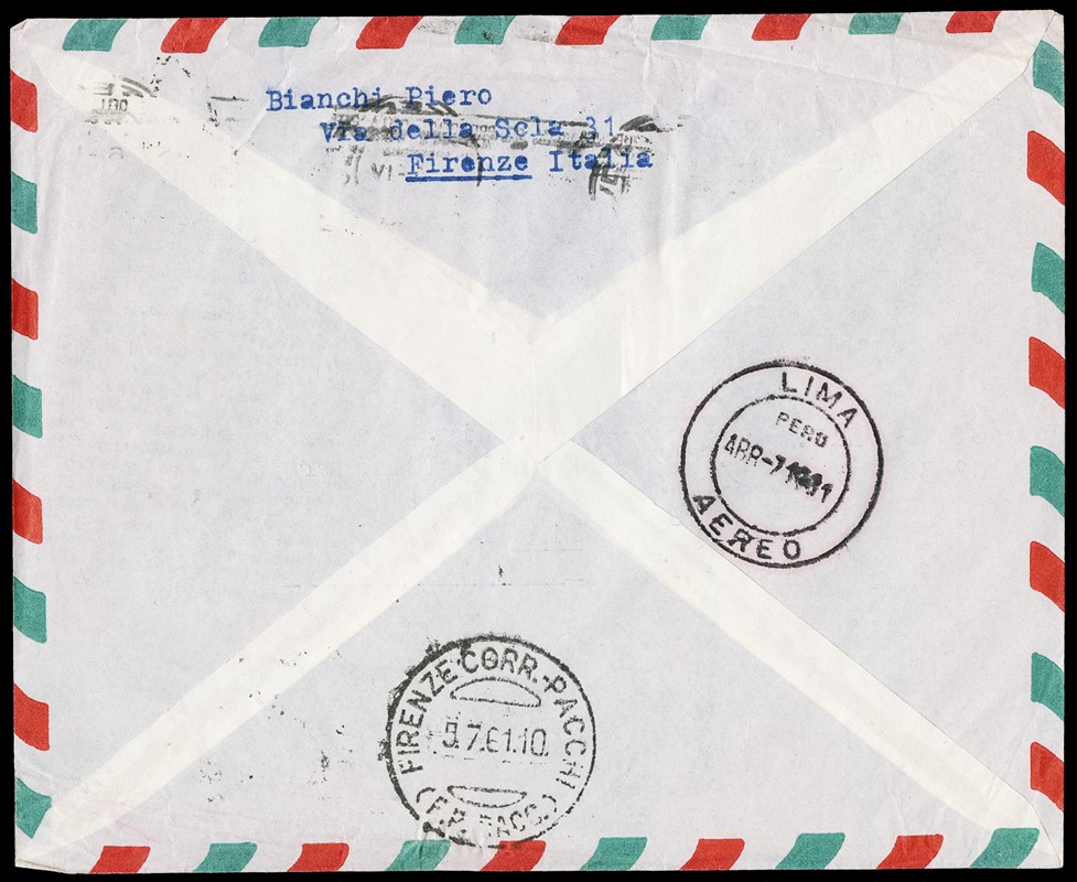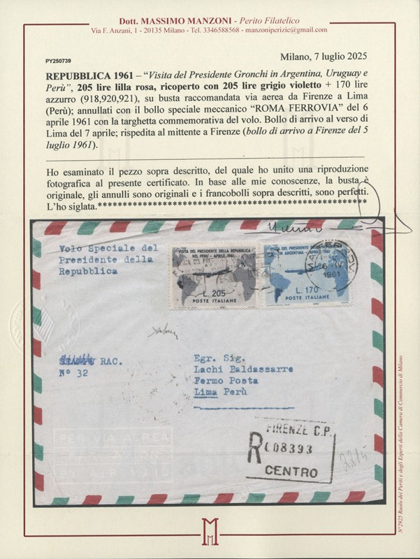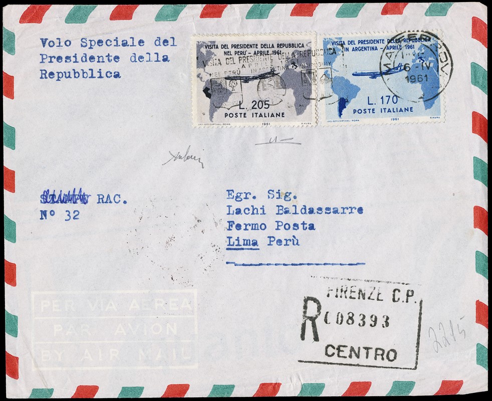 1961 - Visita del Presidente Gronchi in Sudamerica, 170L azzurro e 205L grigio sovrapposto a 205L lilla rosa 'Gronchi Rosa', su lettera del volo speciale del Presidente della Repubblica, da 'ROMA FERROVIA 6 - IV 1961' per Lima. CF Manzoni (Sassone 918+920