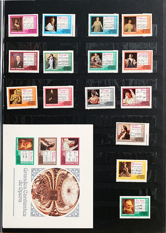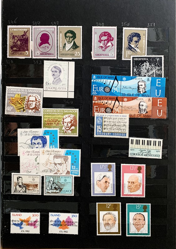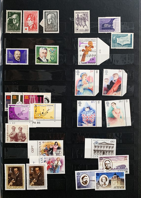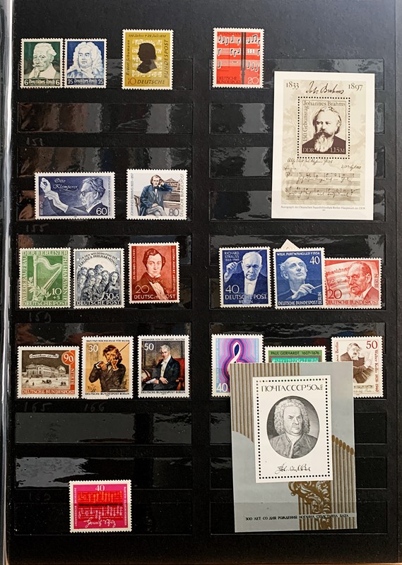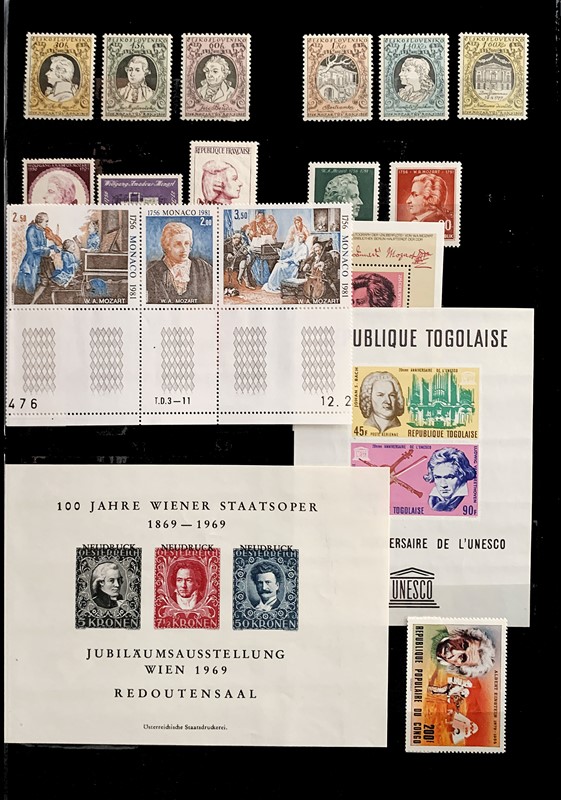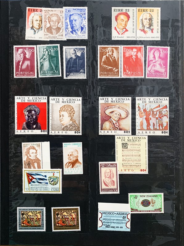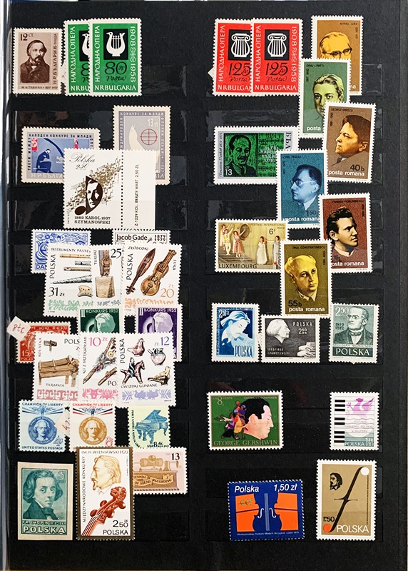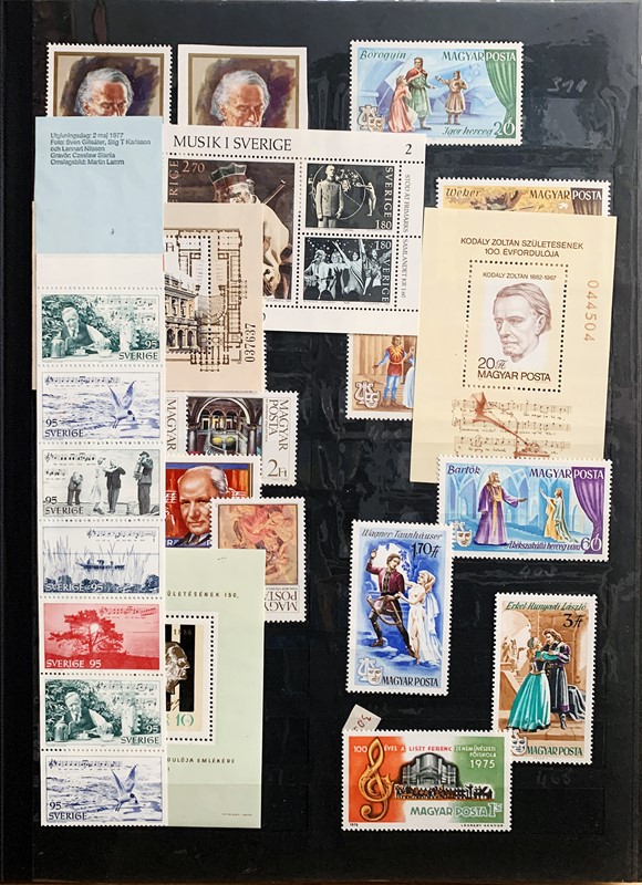 MONDO: accumulazione di spezzature prevalentemente nuove di francobolli e serie SL/TL dell'area italiana e di estero a tematica musica. Qualche buona presenza, il tutto montato su quattro classificatori.