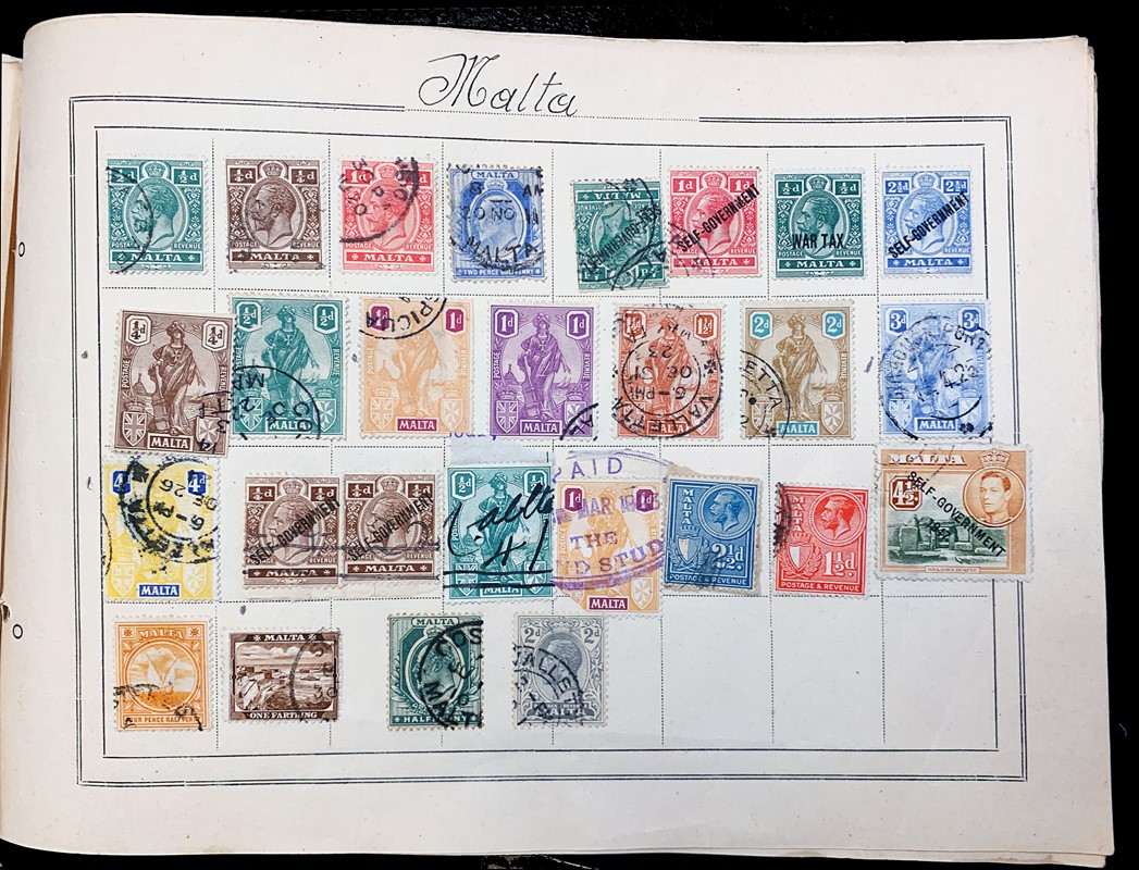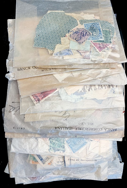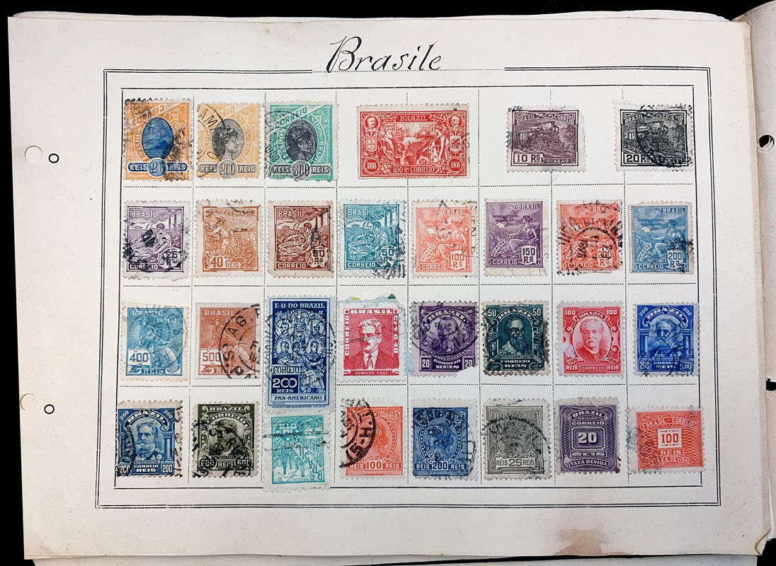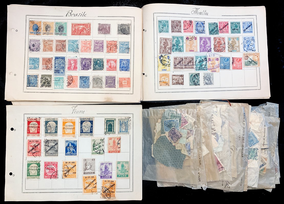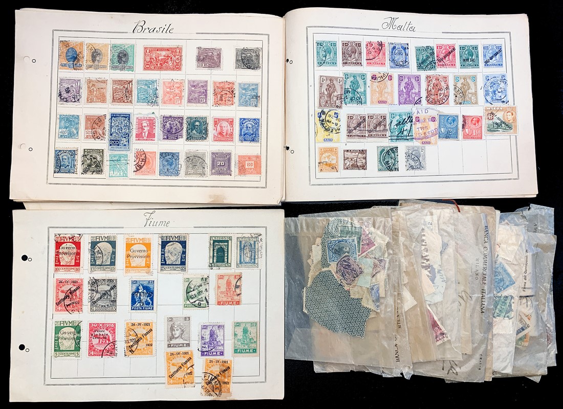 MONDO: Insieme di francobolli di tutto il mondo, per lo piu' usati e anche ripetuti, raccolti in un album Schaubek del 1905, su pagine d'album, su un quaderno e in qualche decina di bustine di pergamino. Qualita' mista con qualche interessante presenza. Merita esame