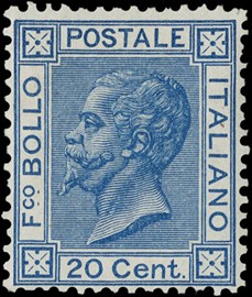 1867 - Regno d'Italia 20c su 15c celeste, ferro di, 1867