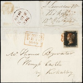 1840 - Gran Bretagna: 1d nero 'Penny Black', pos.B-H, annullato con croce di Malta rossa da 'LONDON LEIGH ST.' [..]