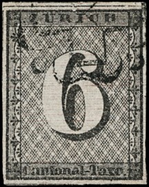 1843 - ZURIGO: 6rp nero con fondo a linee orizzontali, I tipo, ben marginato, annullato rosetta nera. Firma E.Diena, [..]