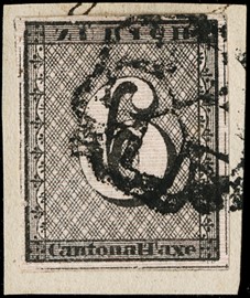 1843 - ZURIGO: 6rp nero con fondo a linee rosse orizzontali, V tipo. Firma Guglielmo Oliva, timbrino Brunn (Zumstein [..]