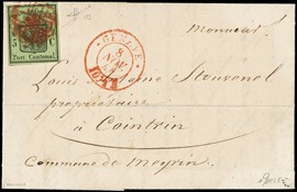 1850 - 10c nero, grandi margini, uso isolato da 'VERONA 24/8' (1856) per Bovolone, nello stesso distretto postale [..]