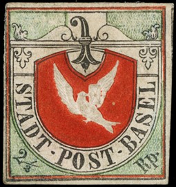 1845 - BASILEA: Saggio 'Colombina' 2 1/2Rp nero, verde e vermiglio. CF E.Diena e finanziario Bolaffi (Zumstein [..]