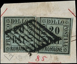 1859 - 20b grigio azzurro, due esemplari annullati a griglia su frammento. Un esemplare corto in basso, l'altro [..]
