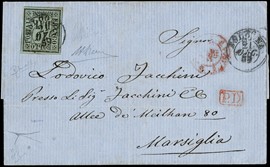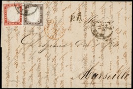 1855 - 10c bruno chiaro rosaceo (seppia) e 40c rosso mattone da 'MILANO 14 DIC 59' a Marsiglia. CF E.Diena e C.Toselli [..]
