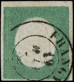 1856 - 5c verde pisello I tav. tir.'55, AdF superiore, annullato 'AIX LES BAINS 8 AOUT 55'. Una delle prime date [..]