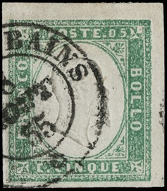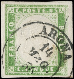1855 - 5c verde giallo, I tav. tir.'55, con grandi margini, annullato 'ARONA 14 MAG. 56'. Molto raro. CF Manzoni [..]