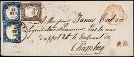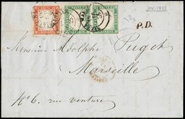 1859 - insieme di tre lettere affrancate con 1b grigio, 2b giallo arancio usato in periodo di tolleranza, e 4b [..]