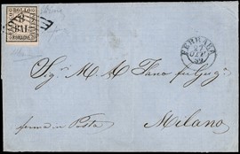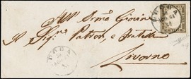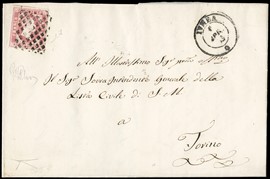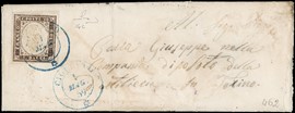 1855 - 10c terra d'ombra scuro, I tav. tir.'58, da 'CIGLIANO 1 MAG 59' (azzurro) a Torino, in tariffa ridotta [..]