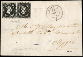 1851 - I emissione, 5c nero, coppia con margini bianchi, su circolare a stampa da 'NOVARA 12 NOV 51' per Oleggio, [..]