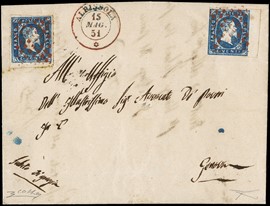 1851 - I emissione, 20c azzurro chiaro, I tir., due esemplari BdF, annullati con bollo a rombi da 'ALBISSOLA 15 [..]