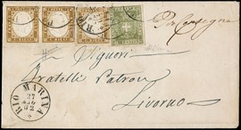 1862 - 5c verde oliva (sfiorato a sinistra) in affrancatura mista con Sardegna IV emissione, 10c bistro oliva, [..]