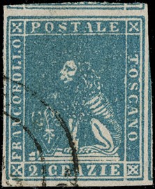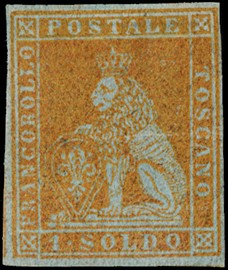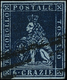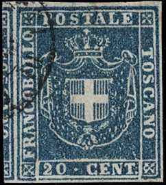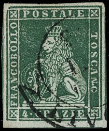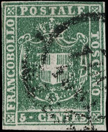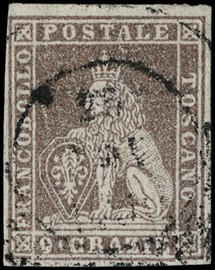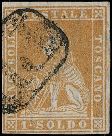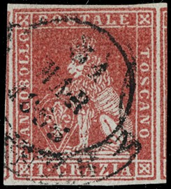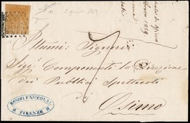 1859 - 1s ocra annullato con muto a rombi, uso isolato da 'FIRENZE 5 FEBBRAIO 1859' a Osimo. Francobollo con tre [..]