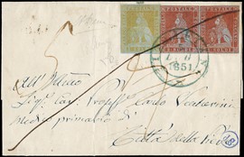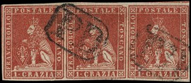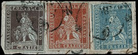 1851 - 2cr azzurro chiaro su grigio, 9cr bruno violaceo su grigio e 60cr scarlatto su grigio con quattro grandissimi [..]