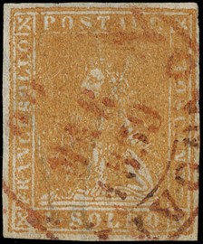 1857 - 1s ocra con margini bianchi e annullo rosso, 1857