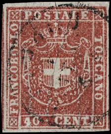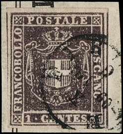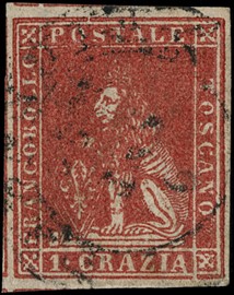 1857 - 1cr carminio, ST3 orizzontale, con margini bianchi regolari su tutti e quattro i lati (quello di destra [..]