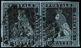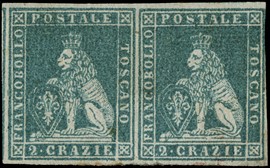 1851 - 1s giallo limone su azzurro e 2s carminio su azzurro, coppia, tutti con filetti completi, da 'PITIGLIANO [..]