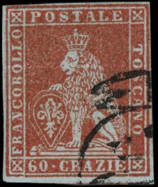 1851 - 60cr scarlatto su grigio con margini completi, annullo leggero e cifra visibile. CF Guglielmo Oliva (storico) [..]