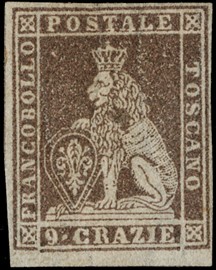 1851 - 9cr bruno violaceo su carta grigia, nuovo, con margini bianchi su tutti e quattro i suoi lati. Molto raro. [..]