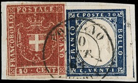 1851 - 1s giallo limone su azzurro e 2s carminio s, 1851