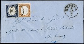1862 - Sardegna 10c bruno rossastro e Regno d'Italia Matraire 20c indaco, in affrancatura mista da 'MODICA 2 SET [..]