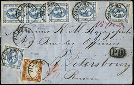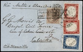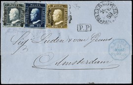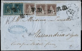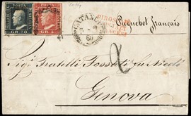 1862 - Matraire 20c indaco e 40c rosso carminio, in affrancatura mista con Sardegna IV emissione 10c arancio ocra, [..]