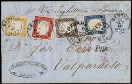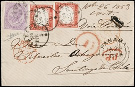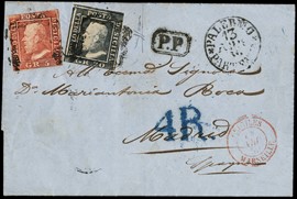1859 - Sicilia, 5gr rosa carminio, I tav., e 20gr grigio ardesia, da 'PALERMO 13 APRILE 1859' a Madrid. Francobolli [..]