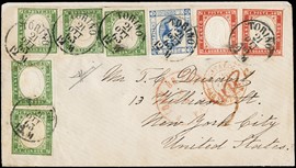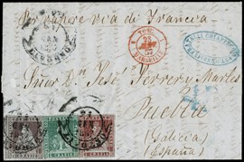 1857 - Toscana, 1cr carminio, 4cr verde e 9cr viola bruno, da 'LIVORNO 21 GENNAIO 1857' a Puebla (Spagna). Rara [..]