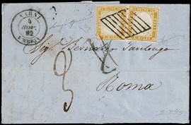 1862 - 10c bistro oliva, colore tendente allo scuro, coppia orizzontale, da 'TERNI 24 MARZO 1862' a Foligno. Sigle [..]