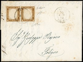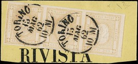 1862 - 2c bistro, ST3 orizzontale ben marginata, 'TORINO 15 MAG 62', prima data nota. 2 lettere conosciute, pochi [..]
