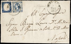 1863 - 15c azzurro tipo Sardegna e 15c azzurro, litografico del I tipo, da 'PAOLA 20 MARZO 1863' a Napoli. Francobolli [..]