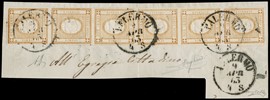 1859 - Sicilia, 2gr azzurro chiaro, III tav, coppia orizzontale (pos.94 e 95), 5gr carminio, I tav (pos.64) e [..]