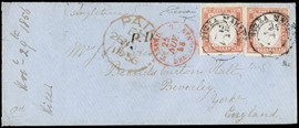1858 - Toscana, 1cr carminio e 6cr azzurro chiaro, coppia orizzontale, da 'LIVORNO 7 AGOSTO 1858' a Cipro. Francobolli [..]