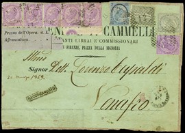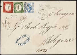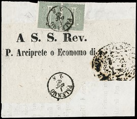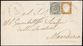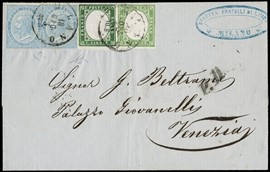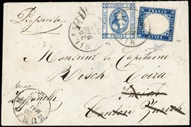 1863 - 15c azzurro tipo Sardegna in affrancatura mista con 15c azzurro litografico II tipo, con francobolli perfetti. [..]