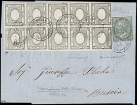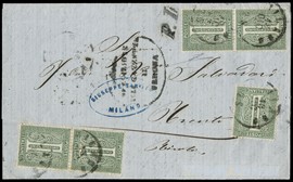 1863 - 1c verde grigio chiaro DLR (LO), due coppie verticali e singolo su circolare da 'MILANO 18 DIC 63' a Trento. [..]