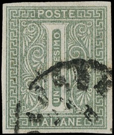 1863 - 1c verde grigio chiaro, DLR Londra, non dentellato e ben marginato, usato a Bologna. Raro, noti solo nove [..]