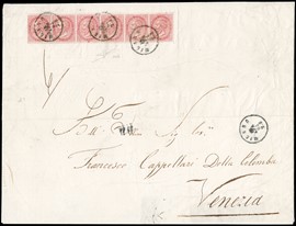 1863 - 40c rosa carminio, DLR Londra, ST6 orizzontale su involucro da 'MILANO 19 APR 64' a Venezia. Massima striscia [..]