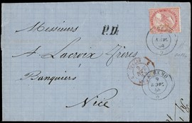 1863 - 40c rosa carminio, DLR Londra, esemplare con appariscente falla di stampa, da 'S.REMO 9 NOV. 64' a Nizza. [..]