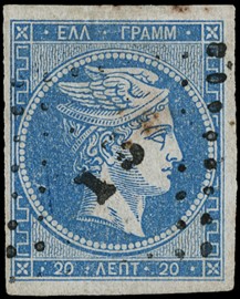 1862 - Grandi teste di Hermes, 20 lepta celeste, tiratura successive di Atene, numero di controllo con varieta' [..]