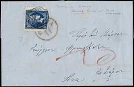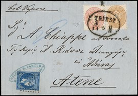 1866 - Grandi teste di Hermes, Austria, 20 lepta azzurro applicato in tassa all'arrivo ad Atene, su lettera da [..]