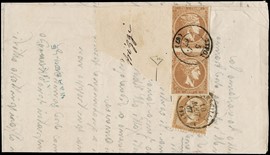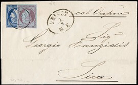 1875 - Grandi teste di Hermes, 2 lepta bistro, coppia verticale, applicata in tassa all'arrivo a Siros su circolare [..]