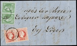 1849 - GUADALUPA: Francia Ceres 25c azzurro, coppia, e 1fr carminio chiaro ST4, tutti con ottimi margini su tutti [..]