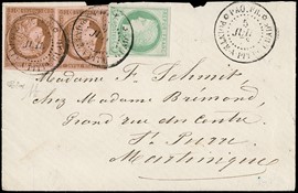 1872/77 - MARTINICA: Ceres 5c verde, coppia, e 30c bruno, tutti con margini bianchi, da 'MARTINIQUE ST. PIERRE [..]