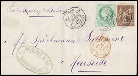 1872/79 - INDIA: Ceres 5c verde con Sage 20c bruno II tipo, entrambi con ottimi margini, da 'INDE PONDICHERY 24 [..]
