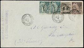 1881/92 - MARTINICA: Emissioni Generali Alphee Dubois 5c verde, coppia, e 25c nero e rosa in affrancatura mista [..]