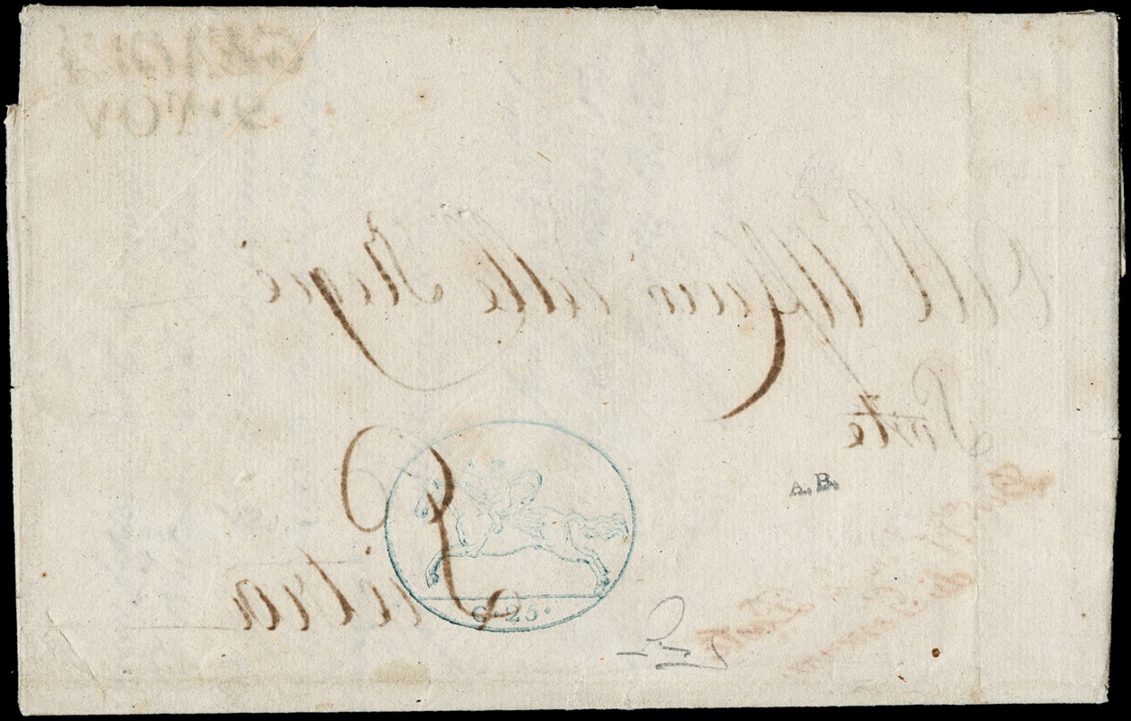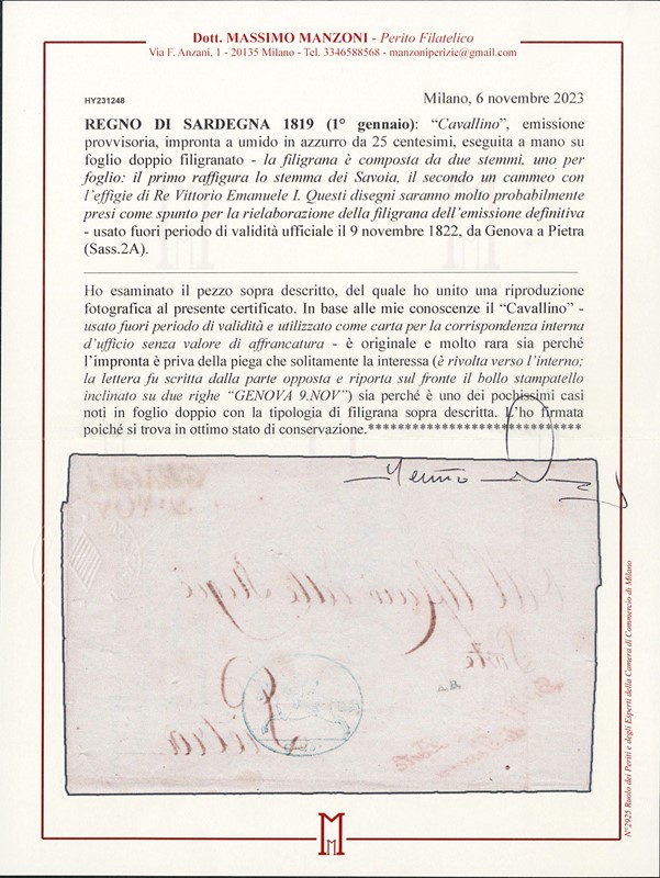 1819 - Serie Provvisoria, 25c su foglio doppio senza piega con filigrana 'stemma araldico' ed 'effigie di Vittorio Emanuele I', da Genova a Pietra il 9 novembre 1822, fuori periodo di validita' ufficiale. Documento molto raro con questa tipologia di filigrana. CF Manzoni (Sassone 2A - Euro 1.500+)