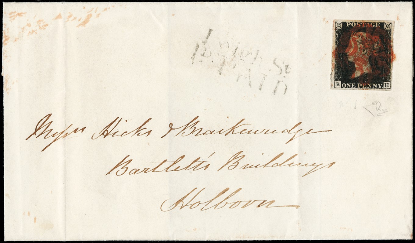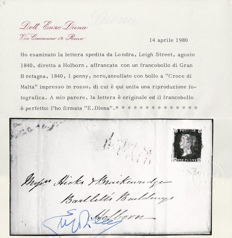 1840 - Gran Bretagna: 1d nero 'Penny Black', pos.B-H, annullato con croce di Malta rossa da 'LONDON LEIGH ST.' per Holborn, nell'agosto 1840. Lineare 'Leigh St./1P PAID' sulla soprascritta. CF E.Diena (SG 1 - GBP 750)